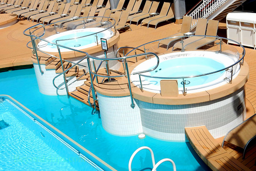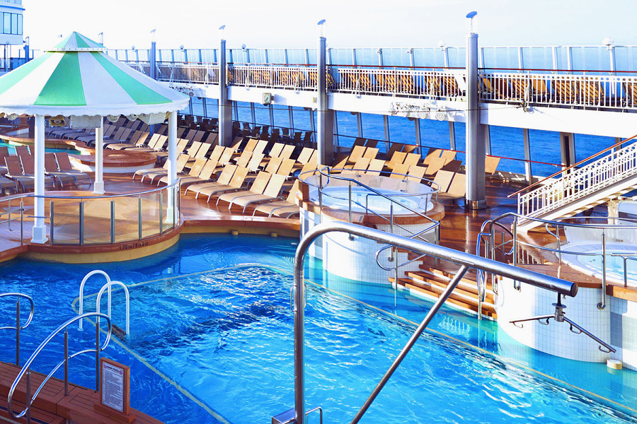 This is the largest venue on board that fits all the guests. Enjoy the entertainment while lounging in a deck chair, in the pool, or even in one of the hot tubs!
